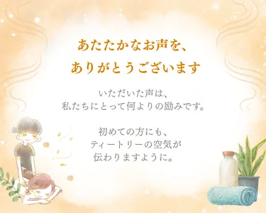 | 返信:ティートリー S様☆ いつもご来店いただきありがとうございます! オイル選びも楽しんでいただけて嬉しいです。 首まわりスッキリされたとのことで安心いたしました。 オプションコースの追加に関しましては、当日決めていただいても大丈夫ですが、後の予約状況によっては追加できない場合がありますのでご予約時にお伝えいただく方が確実です(*^^*) また来月のご予約もいただきありがとうございます。 お会いできるのを楽しみにしております❁ ティートリー 小田千夏 |
