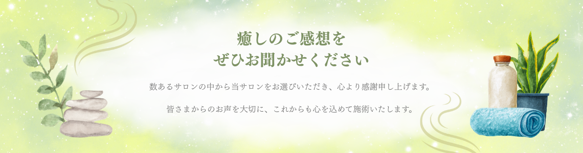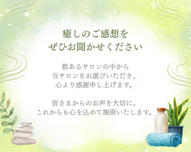 お客様お一人お一人に真心込めた施術を心がけ、健康・癒し・美を提供し、私も皆さんと一緒に、ココロとカラダを癒して健康美を目指していきます☆